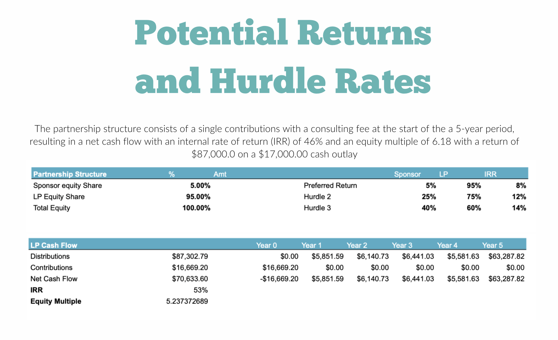 2.Equity Multiple Profit to Investment Ratio 2x would mean $100,000 invested returns $200,000.
