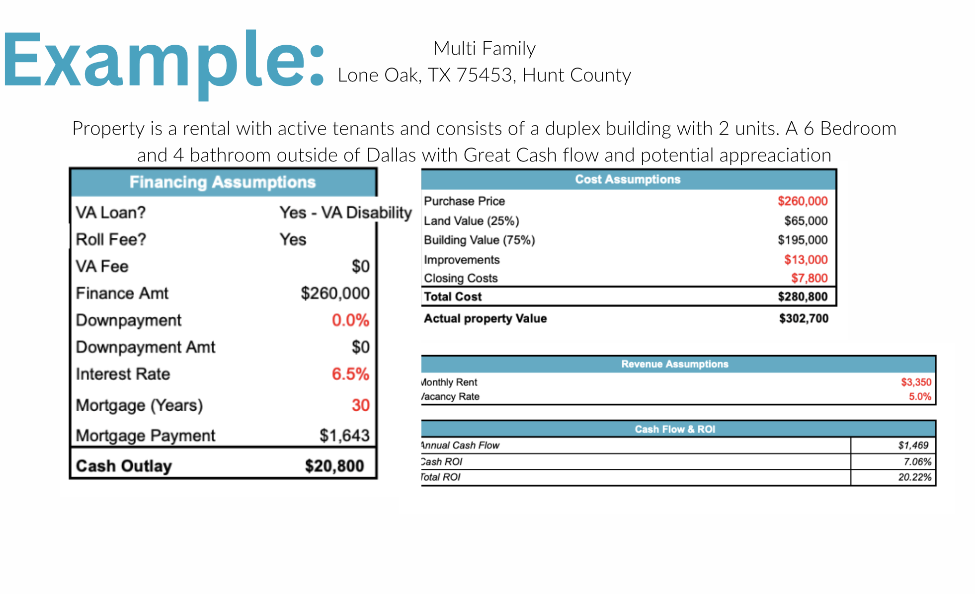 Introducing an exceptional investment type opportunity This example property located at 306 & 308 Mill St, this property is a lucrative 6-bedroom, 4-bath duplex priced between $200,000.00 to $260,000.00 for acquisition. Currently generating $3,350.00 in monthly cash flow, this rental property comes with active tenants and promising potential for appreciation. With a strategic repair plan including new floors, cabinet doors, appliances, and more, this investment offers a robust return on investment. Partner with us for a single contribution and consulting fee, yielding a compelling net cash flow, an impressive internal rate of return (IRR) of 46%, and an equity multiple of 6.18 over a 5-year period, ensuring a return of $87,000.00 on a minimal cash outlay of $17,000.00. Don't miss out on these opportunities to secure your future in real estate investment.